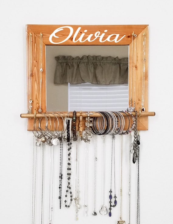 Personalized Jewelry Organizer With Mirror Bracelet Bar Necklace Hooks Wall Mounted Jewelry Holder Jewelry Display Jewelry Storage