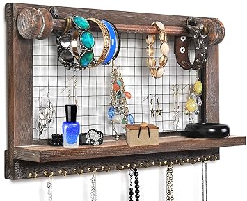 Wall Necklace Holder And Jewelry Organizer Large Rustic Hanging Display Includes Bracelet Bar Earrings Grid 18 Hooks And Shelf Perfect Gift For