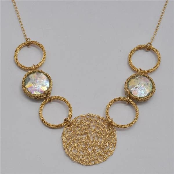 Ancient Roman Glass Necklace With Hand Crocheted Gold Plating