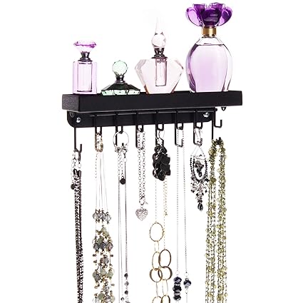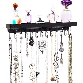 Angelynn S Necklace Holder Organizer Wall Hooks Hanging Closet Jewelry Storage Rack Floating Shelf Fiona Black
