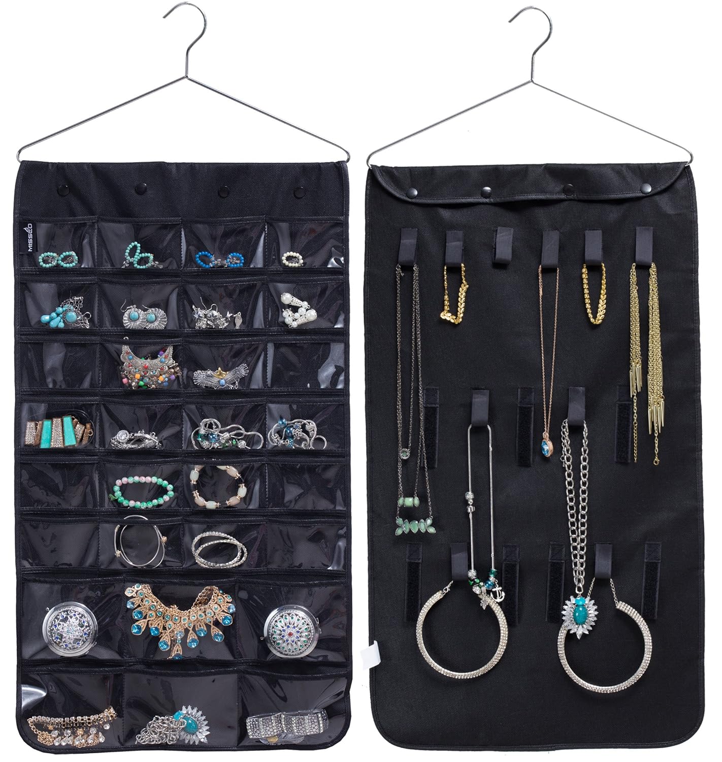 Misslo Closet Jewelry Hanging Non Woven Organizer Holder 30 Pockets 17 Hook And Loops With Hanger Black